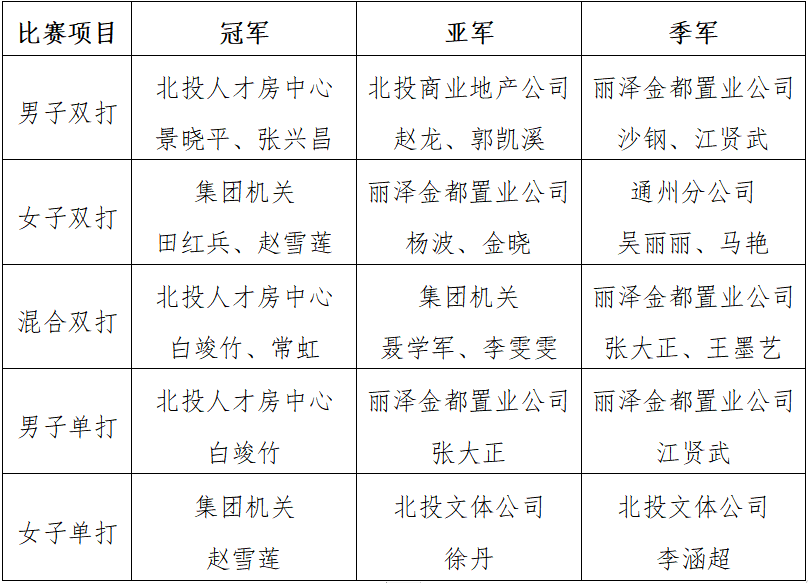 北投人才房中心景曉平、張興昌,北投商業(yè)地產(chǎn)公司趙龍、郭凱溪,麗澤金都置業(yè)公司沙鋼、江賢武鏖戰(zhàn)群雄,分別獲得男子雙打前三名;集團(tuán)機(jī)關(guān)田紅兵、趙雪蓮,麗澤金都置業(yè)公司楊波、金曉,通州分公司吳麗麗、馬艷也毫不示弱一路過關(guān)斬將,取得女子雙打一、二、三等獎(jiǎng);在混合雙打比賽中,北投人才房中心白竣竹、常虹,集團(tuán)機(jī)關(guān)聶學(xué)軍、李雯雯,麗澤金都置業(yè)公司張大正、王墨藝靚出風(fēng)格,賽出氣勢,分別奪得前三名;在男單、女單的比賽中,各參賽選手紛紛拿出看家本領(lǐng),使出渾身解數(shù),展現(xiàn)個(gè)人實(shí)力與魅力,男單前三名分別是北投人才房中心白竣竹,麗澤金都置業(yè)公司張大正、江賢武,女單前三名分別是集團(tuán)機(jī)關(guān)趙雪蓮,北投文體公司徐丹、李涵超。本次比賽還設(shè)置了團(tuán)體獎(jiǎng),根據(jù)各參賽隊(duì)的比賽積分,北投人才房中心獲得團(tuán)體冠軍、麗澤金都置業(yè)公司獲得團(tuán)體亞軍、集團(tuán)機(jī)關(guān)獲得團(tuán)體季軍。