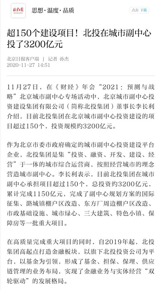 目前,北投集團在城市副中心承擔項目超過150個,總投資約3200億元,完成了副中心規(guī)劃方案的國際征集、潞城鎮(zhèn)棚戶區(qū)改造、東方廠周邊棚戶區(qū)改造、市政基礎設施、城市綠心、三大建筑、特色小鎮(zhèn)、保障房等一批重大項目。