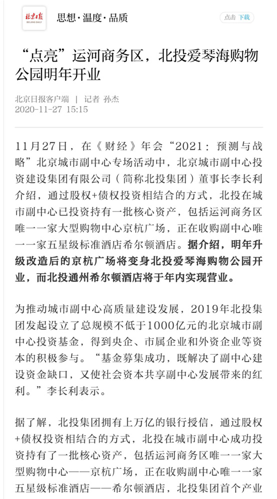“十四五”時期,北投集團將進一步貫徹落實黨的十九屆五中全會精神和習近平總書記在北京考察時的重要講話精神,全面貫徹新發(fā)展理念,全力推動城市副中心高質量建設發(fā)展,為將城市副中心打造成為國際一流的和諧宜居之都示范區(qū)、新型城鎮(zhèn)化示范區(qū)、京津冀區(qū)域協(xié)同發(fā)展示范區(qū),助力通州區(qū)繁榮發(fā)展,作出新的更大貢獻。