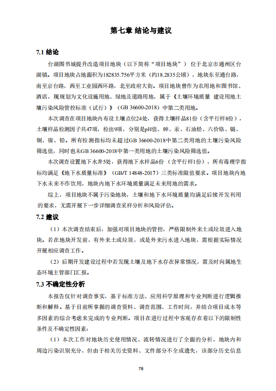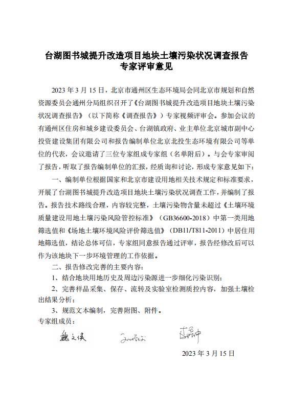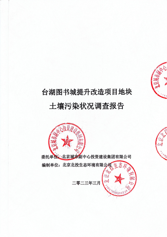 北京城市副中心投資建設集團有限公司根據(jù)《中華人民共和國土壤污染防治法》、《污染地塊土壤環(huán)境管理辦法(試行)》(部令第42號)等相關法律法規(guī)要求,委托北京北投生態(tài)環(huán)境有限公司在充分搜集場地歷史及場地環(huán)境相關資料的基礎上,通過現(xiàn)場踏勘、社會調查、勘察、采樣、檢測及相關分析等工作,編制完成了《臺湖圖書城提升改造項目地塊土壤污染狀況調查報告》。