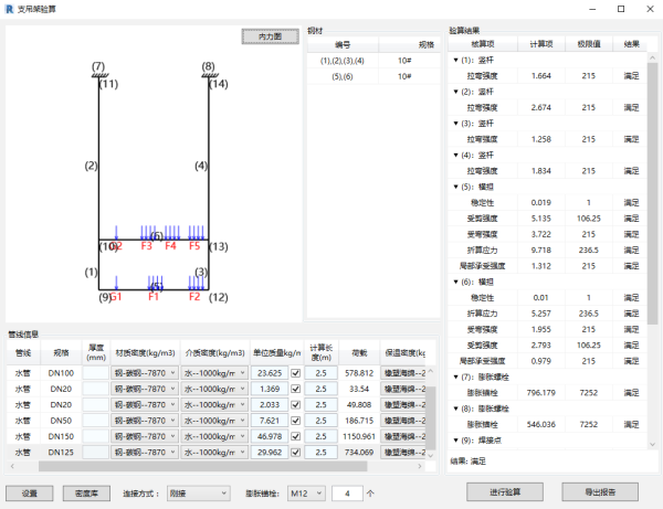(6)支吊架驗算:借助BIM軟件結(jié)合支吊架的安裝方案,進行支吊架數(shù)據(jù)安全性的驗算,出具支吊架計算書并得到設(shè)計院復(fù)核的簽字認(rèn)可。